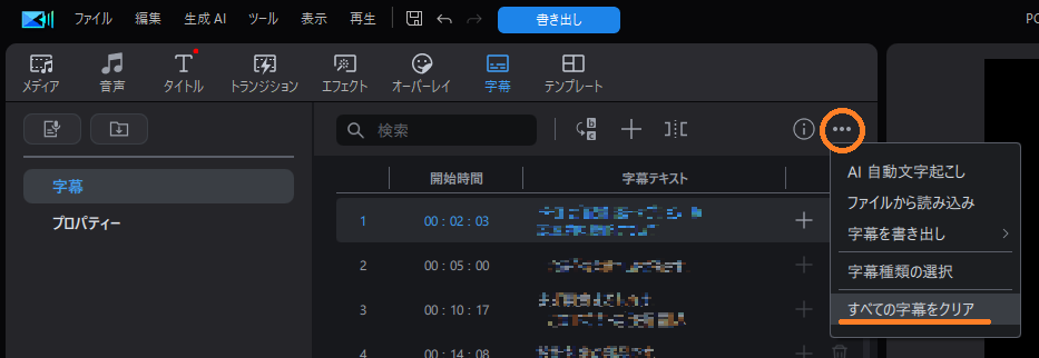 - 字幕をクリアをクリックして全字幕を消去。