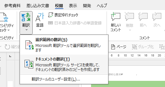 校閲タブ >翻訳 >選択範囲の翻訳 or ドキュメントの翻訳