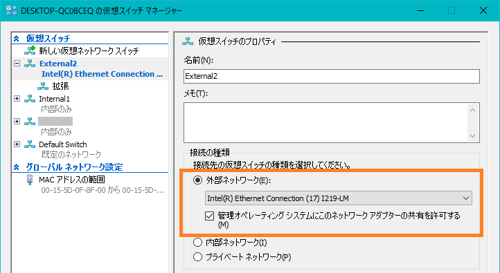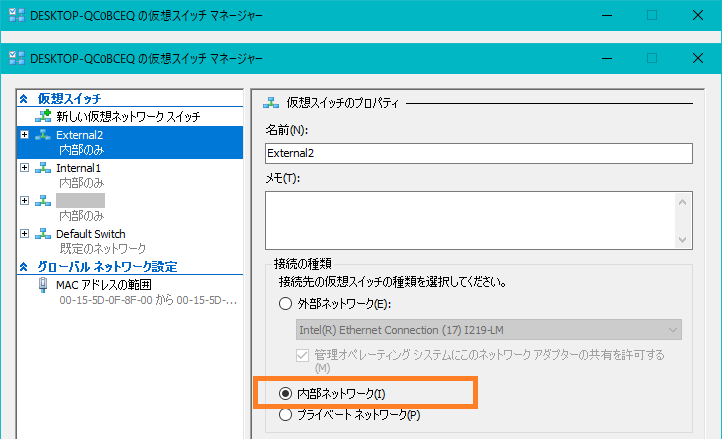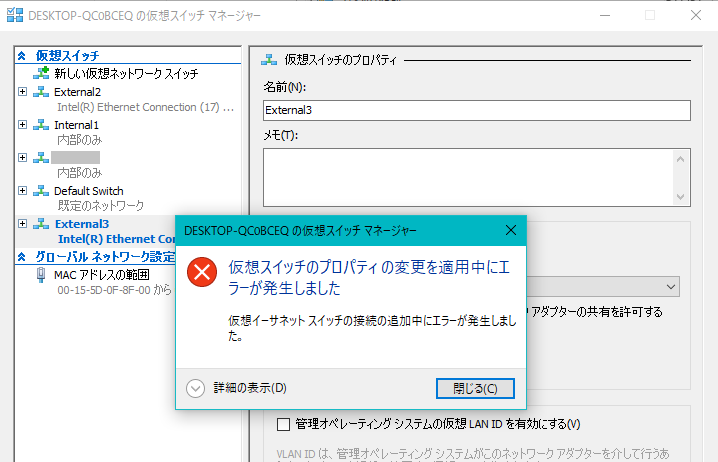 仮想スイッチに外部ネットワークとして、イーサネットアダプタを割り当てると、物理アドレスが入れ替わってしまう。